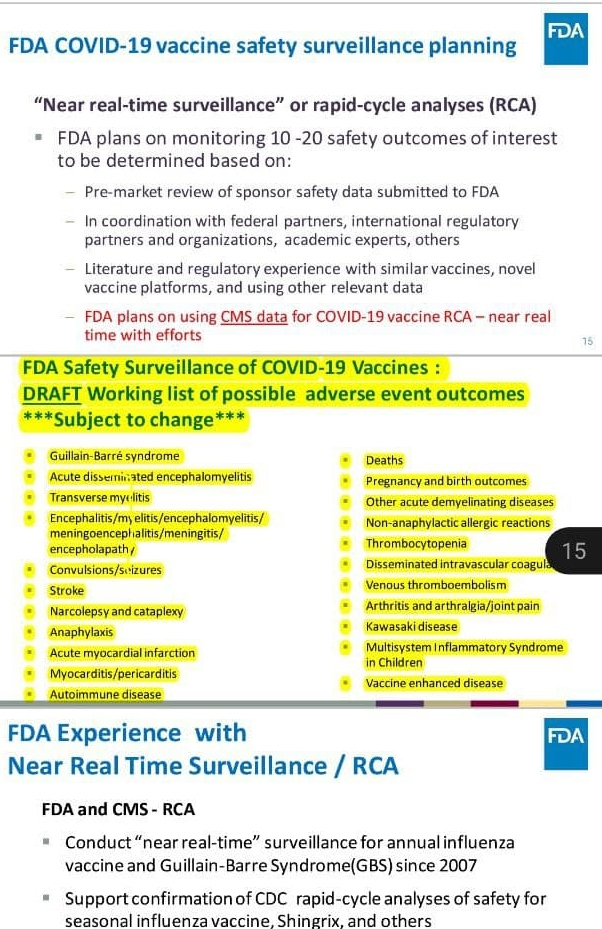 Aquí una lista de efectos adversos que vigila la Administración Federal de Drogas de EU, la cual nunca reportan en las noticias. Para esto, no hay aprobación oficial de ninguna de las vacunas, aunque así lo hayan reportado. Fue una manipulación de información para dar un falso sentido de seguridad a la población. Ahora vienen por tus hijos.