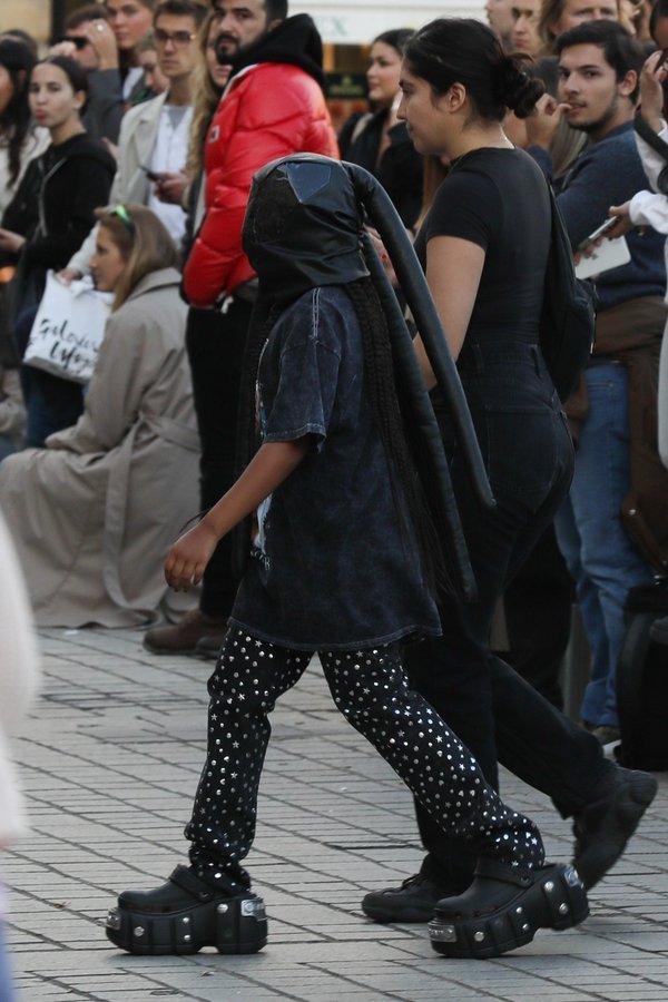 Como influencer, el segundo grupo demográfico más grande de seguidores de Kardashian son menores de edad. Aquí se ve la Kardashian vestida como Gimp, un sumiso sexual, casi siempre masculino, vestido generalmente con un traje de cuero negro diseñado por Balenciaga. Ser un gimp, en esencia, se trata de separarse de la humanidad y el individualismo, de aceptar ser un objeto y un juguete para el uso de su Dominante. Lo que lleva en la cabeza es una capucha gimp lo cual sirve precisamente para despersonalizar al individuo y cuyo uso principal es para el sexo fetichista. Aun así, permite que su propia hija de 9 años lo use en público lo cual la hace verse bastante hipócrita.