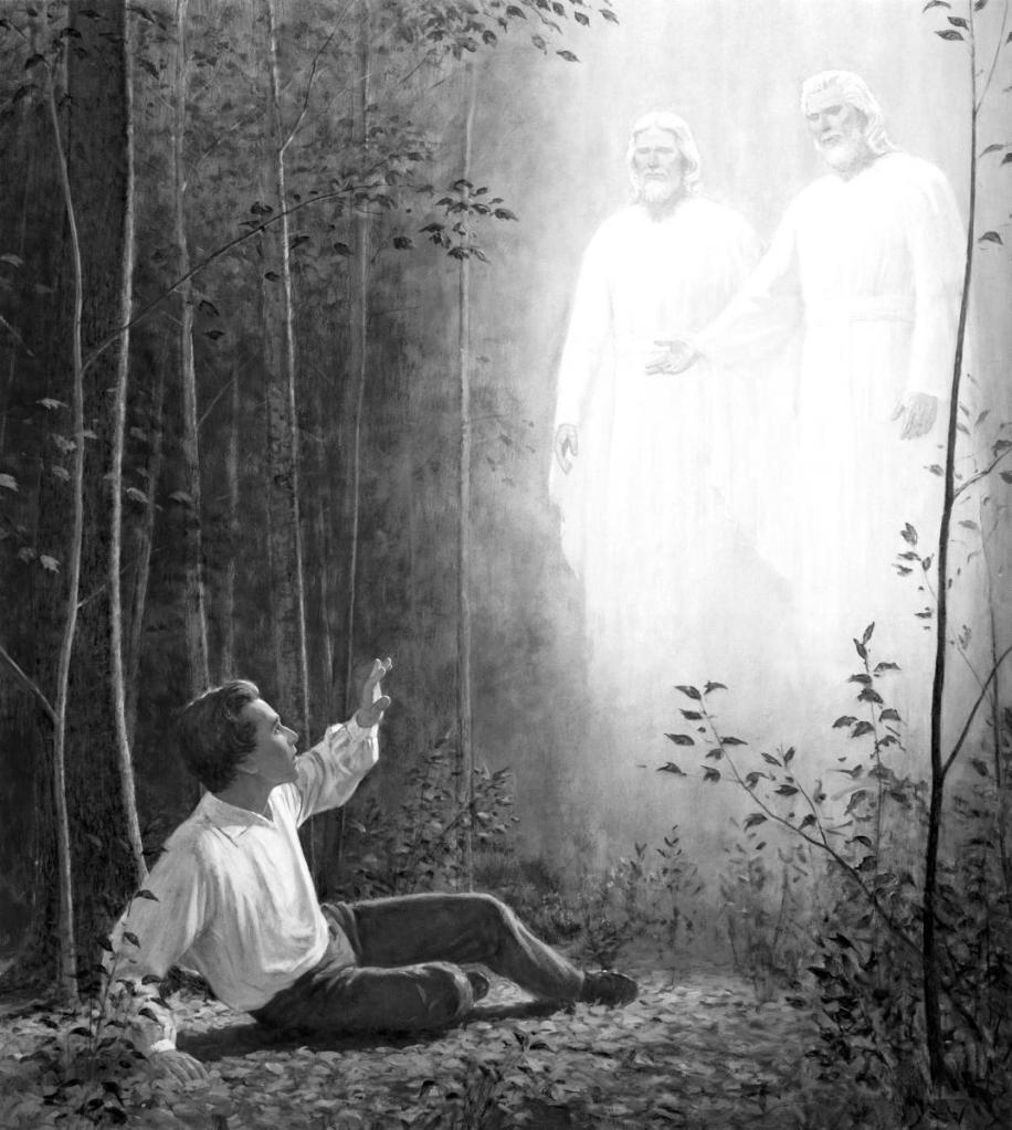 A la edad de catorce años, José decidió ir solo al bosque en busca de iluminación, mientras ofrecía los deseos de su corazón a Dios, fue rodeado por la oscuridad y sintió que algo del reino invisible se apoderaba de él. Entonces, dos seres descendieron desde arriba y su luz se posó sobre él. Smith escribió: Cuando la luz se posó sobre mí, Vi dos Personajes, cuyo brillo y gloria desafían todo descripción, de pie sobre mí en el aire. Uno de ellos me habló, llamándome por mi nombre y diciendo, señalando al otro: Este es Mi amado Hijo. ¡Escúchalo! Cuando se repuso, Smith les preguntó a qué iglesia debería unirse. Le respondieron que ninguna religión era la correcta. Después de los apóstoles, la verdad había sido abandonada y el mundo entero estaba en apostasía.