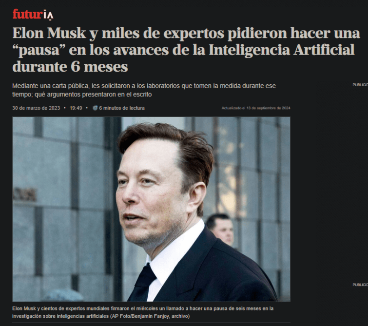 En una carta abierta dirigida a laboratorios de IA, firmada ahora por más de 30,000 científicos informáticos, desarrolladores de IA, políticos, académicos, celebridades y otros, se solicitó una pausa en los experimentos con IA. La carta afirma: “Los sistemas de IA con inteligencia competitiva a nivel humano pueden plantear riesgos profundos para la sociedad y la humanidad, como lo demuestra una amplia investigación y lo reconocen los principales laboratorios de IA.”